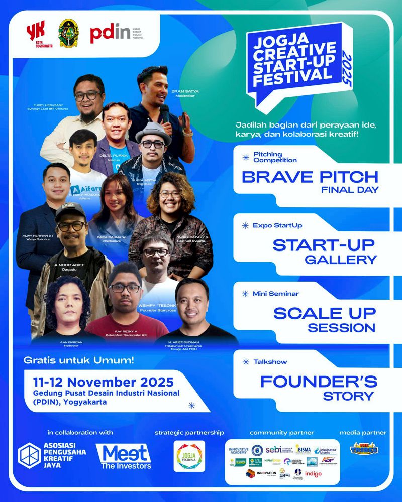 Festival start-up terbesar Jogja hadir 11–12 November 2025 di PDIN, menampilkan Brave Pitch, Start-Up Gallery, seminar, dan founder talks.