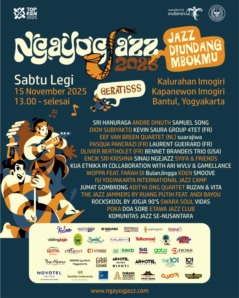 Ngayogjazz 2025 hadir gratis 15 November di Imogiri, Bantul, Yogyakarta. Tagline “Jazz Diundang Mbokmu” ajak nostalgia jazz nusantara & internasional bareng Sri Hanuraga hingga Bennet Brandeis Trio. Seru banget, komunitas jazz se-Nusantara guyub ria!